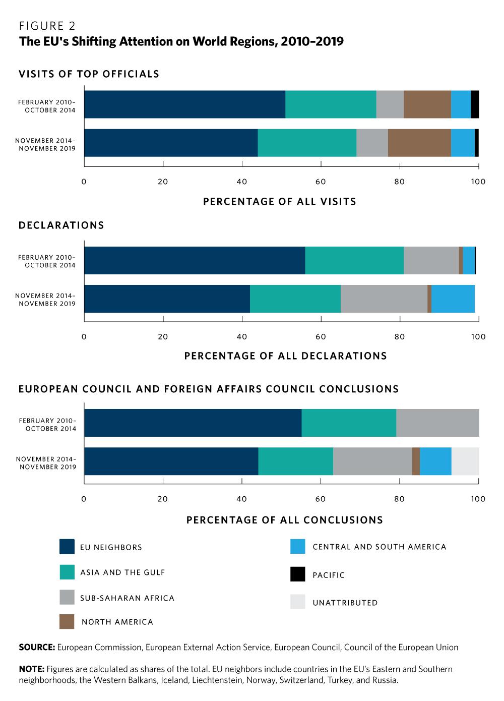 However, all indicators measuring the EU’s attention to foreign policy topics—in particular, travel by top officials, declarations by the high representative, and council conclusions—reveal a relative decline in the emphasis on neighboring regions (see figure 2). Instead, the union paid more attention to sub-Saharan Africa and Central and South America.