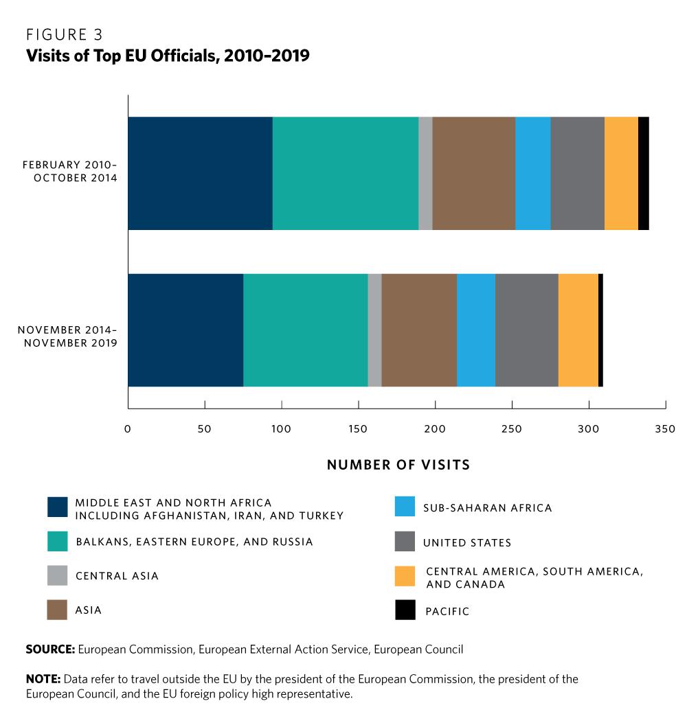 The top institutional actors of EU external policy are the president of the European Commission, the president of the European Council, and the EU high representative for foreign affairs and security policy. They interact with their international counterparts in different ways: over the phone, by receiving visitors and convening conferences in Brussels, and by visiting foreign capitals. As they are busy people and international travel is costly and time consuming, their trips are a useful indicator of the priorities of EU foreign policy.