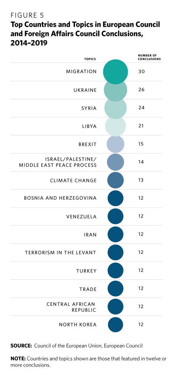 The data show that migration, developments in Syria and Libya, and terrorism in the Levant were among the top preoccupations of EU governments, featuring eighty-seven times in total. The crisis in Ukraine was mentioned twenty-six times (see figure 5). Overall, almost 45 percent of the conclusions concerned events in a neighboring region: as with the high representative’s declarations, this marks a reduction from 55 percent in 2010–2014.