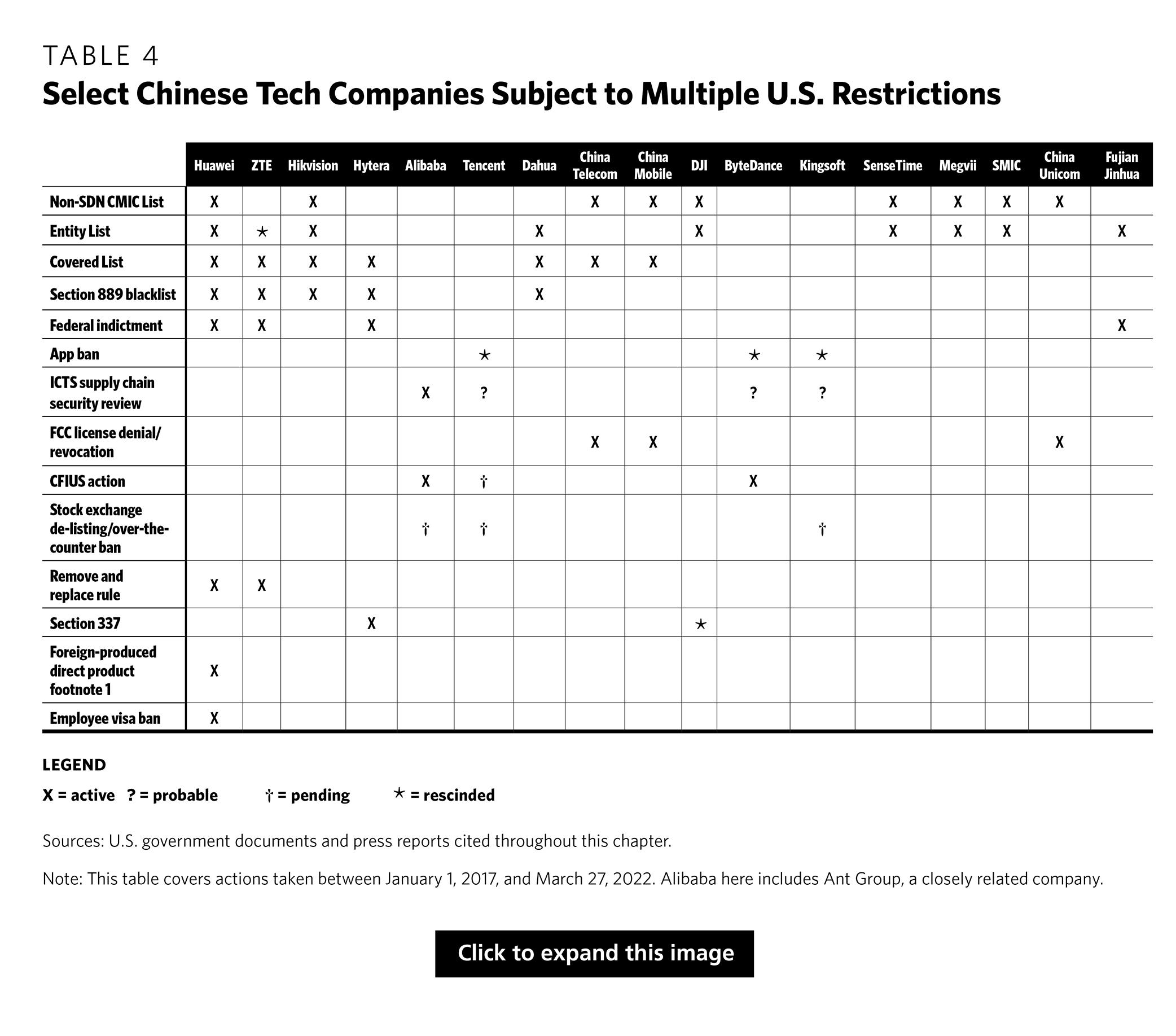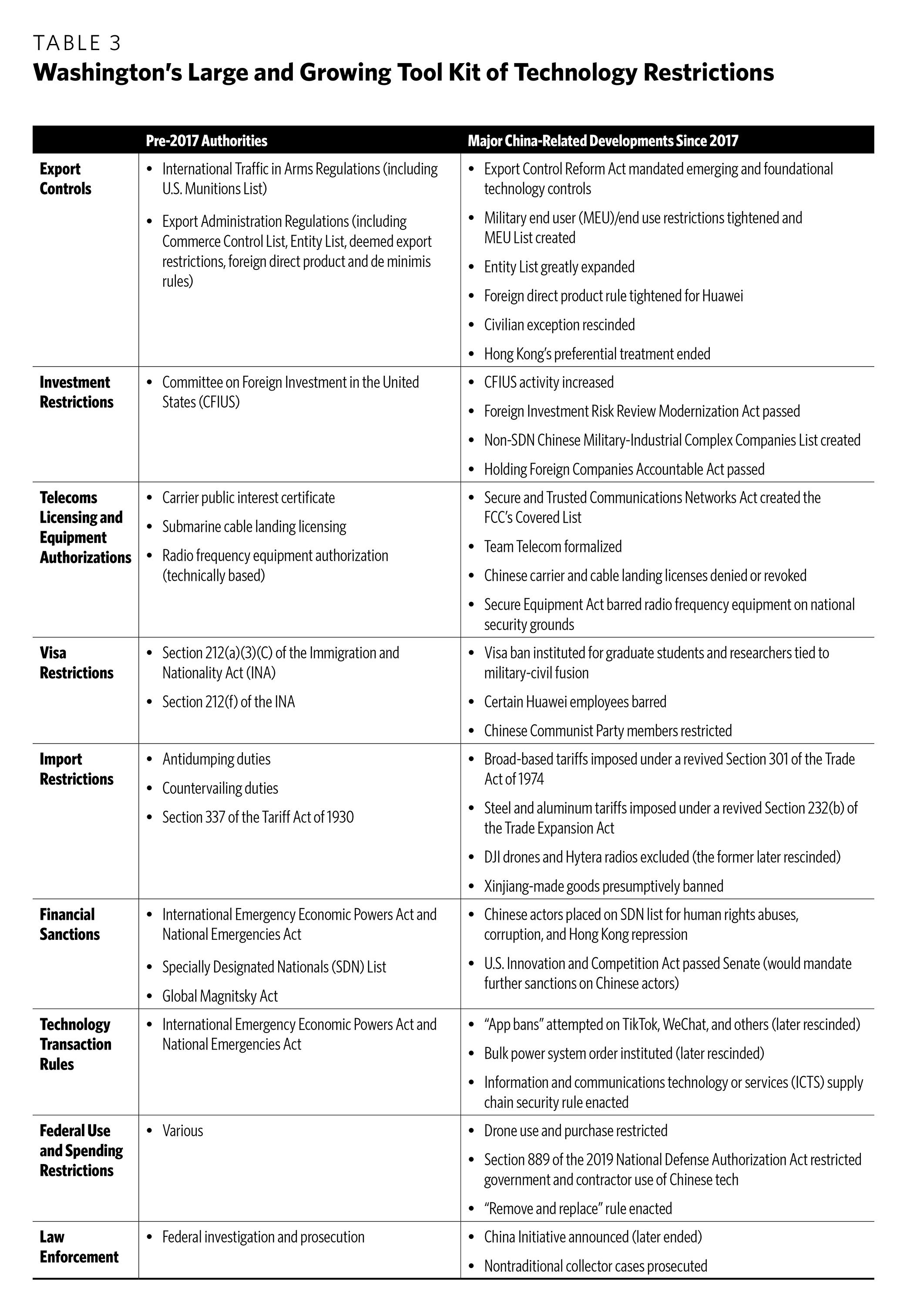 U.S. policymakers must have a firm grasp of the many different tools used to curb bilateral technology interdependence. Defensive tools are often described generically as “sanctions” or “blacklists,” but this conflates distinct legal authorities with a range of effects and implementing agencies. For example, SenseTime and Hytera are among the Chinese tech firms most targeted by U.S. controls, yet the restrictions imposed on each company do not overlap at all. Huawei, meanwhile, suffers from nearly all of the controls placed on both SenseTime and Hytera, plus others that are completely unique. To clarify the picture, this report offers a primer on key U.S. defensive authorities and how they have targeted the Chinese tech sector.